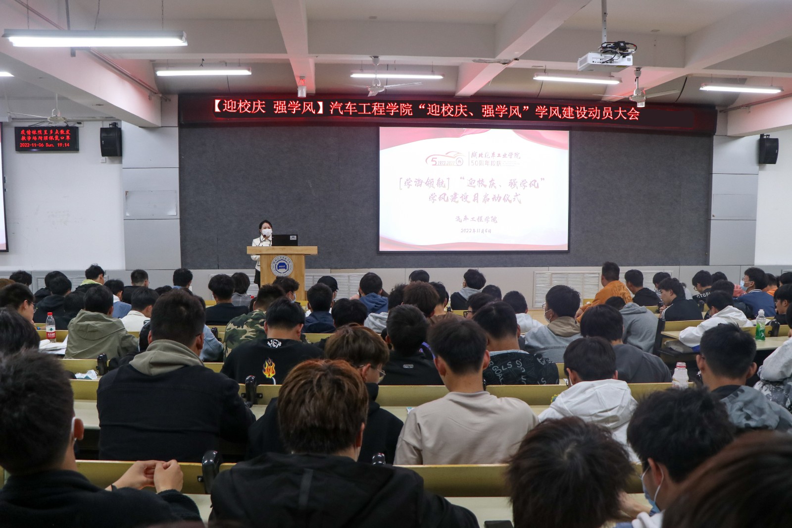 9001cc金沙11月6日晚在6113报告厅、5201教室分年级召开以“迎校庆、强学风”为主题的学风建设动员大会。9001cc金沙学工办主任胡霄寒、辅导员李键雯、李旭、甘甜以及车院全体学生参加了此次活动。