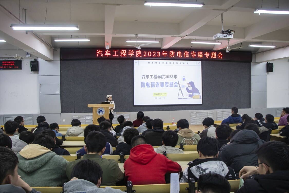 为推动平安校园创建,进一步增强学生安全防范意识,切实保护广大同学的财产安全,2月19日晚上,9001cc金沙于6113报告厅召开2023年防电信诈骗专题大会。分党委副书记杜昕俊、学工办主任胡霄寒、辅导员李旭及车院20级全体同学参会。