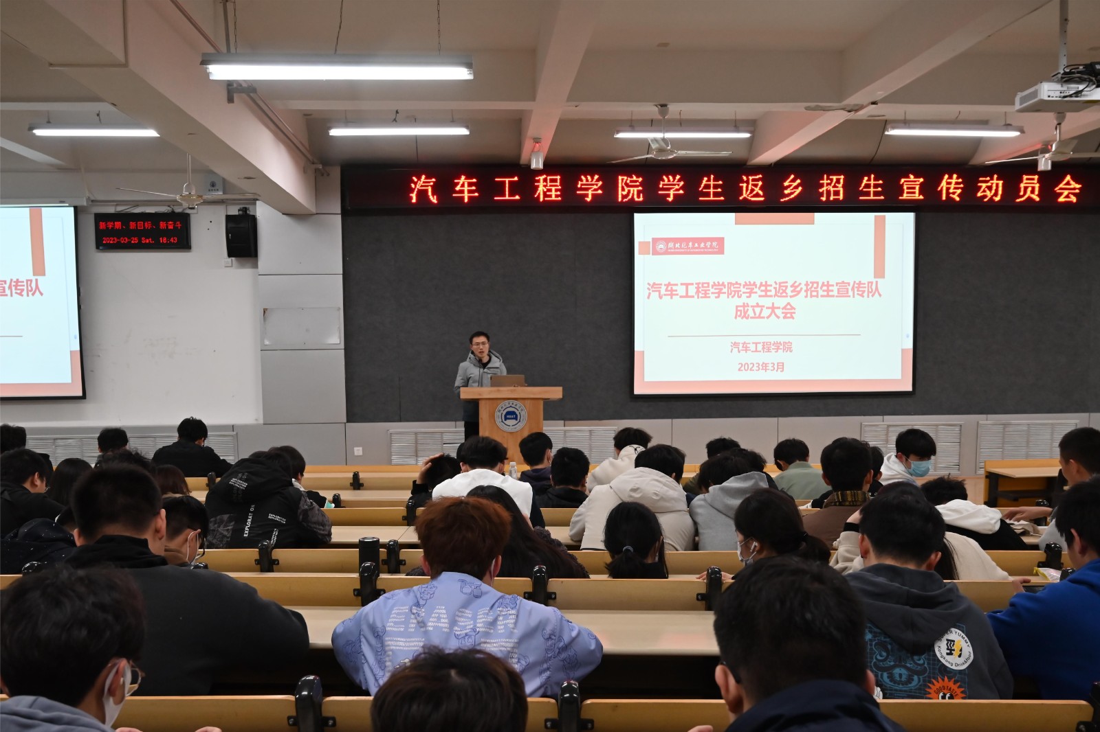 随后,李旭从学生返乡招生宣传的流程、宣传形式、所需物料、注意事项等向同学们讲解了学院2023年学生返乡招生宣传的总体安排;介绍了学院在房县、宜昌市和广西壮族自治区等区域的招生情况;并对现场22级各班组建招生宣传队提出了具体建议。李旭鼓励同学们将参与返乡招生宣传与校史学习、社会实践活动相结合,积极宣讲汽院特色,讲好“汽院故事”。