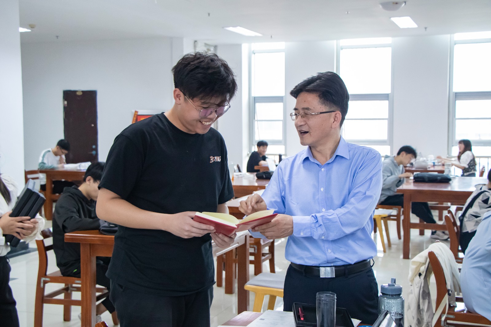张文学直奔图书馆四楼自习室,边走边看学生们的复习情况。在9001cc金沙20级考研学生集中复习区,张文学仔细询问了车辆203班金浩东同学的复习情况、班上整体的考研比例、择校方向和复习状态。当了解到当前存在学生考研专用教室匮乏、考研针对性辅导力度不足的问题时,张文学一一记录,并表示会尽快解决,尽全力为考研学子创造良好的学习条件和环境。随后,张文学为4名考研学子送上了亲笔签写祝福的笔记本,勉励在场考研学子,牢记习近平总书记嘱托,高扬理想风帆,肩负时代责任,刻苦学习、锤炼本领,勇敢追梦、提升自我。