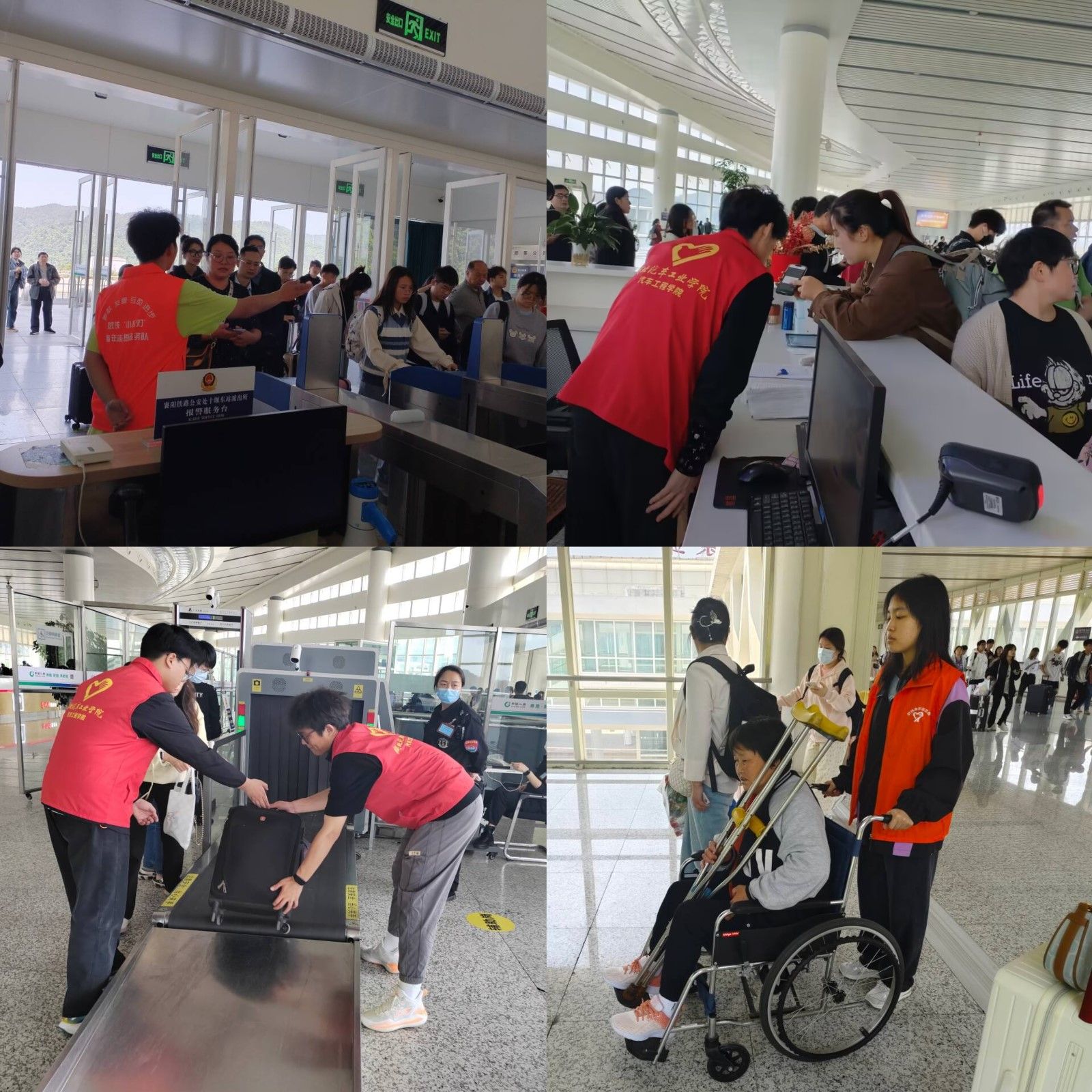 5月1日上午,高铁站负责人对志愿者分别从安全注意事项、岗位职责、礼貌用语、进出站口客流引导等方面进行相关培训。培训结束后,青年志愿者们身穿“红马甲”,分别在售票大厅、安检口、检票口、出站口等服务点全天服务旅客。“五一”假期高铁站人流量增长,志愿者们按照培训要求积极引导乘客在自动售票机上进行改签、打印行程信息和报销凭证,有效缓解人工售票窗口作业压力;在车站进、出站口进行客流引导,并耐心解答乘客关于乘车方面的问题;协助车站工作人员进行安检作用,并主动帮助行动不便的乘客搬运行李。不同服务岗位上的青年志愿者们为维持现场秩序贡献自己的一份力量,用暖心服务为旅客们的出行提供便利。