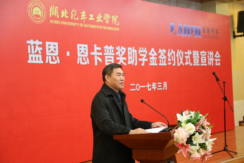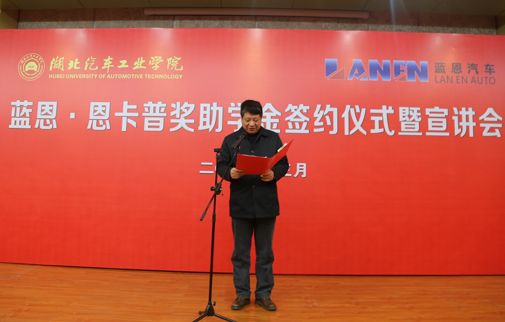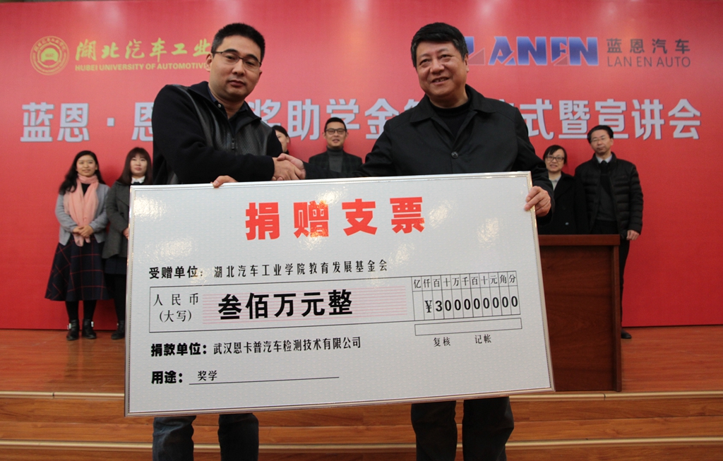 3月24日上午9点,我院03届校友、武汉蓝恩新能源汽车产业发展股份有限公司董事长蒋武代表公司与母校在逸夫图书馆报告厅签订了奖助学金捐赠协议,为母校捐赠300万元设立“蓝恩·恩卡普奖助学金”,这也是我校自建校以来校友企业最大单笔捐赠。