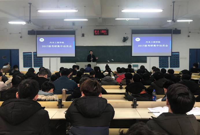 动员会上,李秀峰以PPT方式将17级的年级辅导员及班主任亲切可爱的照片展示出来,展现了学院老师与17级同学的浓厚师生情谊,引得现场一片热烈的掌声和笑声。随后他从学历学位常识、大学分类、学院毕业生考研情况、问题和建议四个方面进行了深入浅出的动员讲话。他强调了学历学位在终身职业发展中的重要作用,分析了当前国家高等教育发展形势和高校的分类,引导学生充分了解高校层次、进行合理定位,并以详细的统计数据和车院学子近五年考研录取情况加以分析,劝导大家理性思考、慎重选择。他还结合往届学子一个个鲜活的考研案例,分析了作为汽院学生在就业、考研、留学等方面的基础和优势,同时结合《汽车产业中长期人才发展研究报告》有关内容,鼓励同学们认清自我定位、树立充足自信,以更高标准对待自己的学业和将来的职业,积极选择考研深造。在考研问题和建议剖析部分,他要求同学们一定要思考和明确考研动机、学习能力、家庭条件、个人定力等问题,鼓励同学们利用即将到来的寒假,主动与父母进行沟通,尽早制定考研规划,“只争朝夕、不负韶华”,以奋斗之青春赴理想之未来。