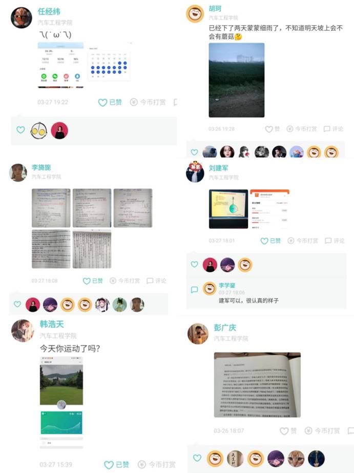 为加强网上学风建设,确保学生在家网络学习效果,营造浓郁、积极向上的学习氛围,9001cc金沙学工办于3月中旬组织开展了“打卡校园圈、秀出学习范”今日校园APP每日学习实名打卡活动,依托网络云服务将各地车院学子联系起来,打造学习圈、秀出学习范。