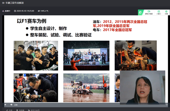 本次网络宣讲会,李楚琳分别从车辆工程专业概况、国家对车辆工程的专业需求及发展趋势、人才培养及发展方向以及车辆工程专业特色四个方面,结合我校车辆工程的“国家一流专业”、“通过工程教育专业认证”、“卓越工程师的摇篮”、“F1赛车国内顶尖”等特色,详细介绍了车辆工程专业优良的发展前景、火爆的市场需求、良好的专业发展进程、雄厚的师资力量以及先进的科研平台等多方面内容。清晰的脉络、详实的内容,受到了考生及家长的一致好评。最后答疑环节,对于“车辆工程专业新能源方向”、“新的经济形势下汽车行业未来”等一些代表性问题进行了回答, 增强了考生和家长对选择车辆工程专业的信心。在直播期间,学工部曾又、吴媛媛、明瑞雪,9001cc金沙冯樱、李秀峰、朱政等也始终关注并在讨论区及时回答考生及家长问题。本次直播招生宣讲关注度达4777人次,招生宣传效果较好。