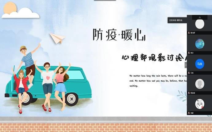 为进一步做好学生居家学习的心理健康教育工作,9001cc金沙于5月10日12:10依托网络平台开展了“防疫·暖心”为主题的线上观影心理健康活动。9001cc金沙心理辅导员李雅琨及学院全体心理委员、寝室信息安全员参加本次活动。