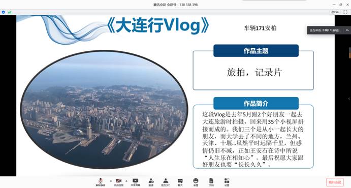 活动从4月上旬开始到,整体分为三个阶段进行。初赛阶段,通过网络投票方式从征集到的60多个视频作品中评选出10个作品进入决赛。决赛环节,选手们通过QQ课堂用3-5分钟时间结合PPT将创作作品的主题与内容、剪辑手法、创意点呈现给评委。最后,在综合评委的评分表决下,车服191班安婷同学的《回归的信念》凭借着唯美的古风形象和动人的故事情节征服全场荣获比赛一等奖。而其他作品也都是用心之作,车服171安柏同学的《大连行vlog》按照时间顺序,从多个角度分享了自己在大连的旅程,表达了“读万卷书、行万路路,每一次旅行都是人生的成长”的感怀;车辆192班张嘉瑞同学的《潼》分享了家乡的风光和日落美景,镜头中都是家乡无法忘却的一草一木,人与自然和谐相处之美感油然而生。在第三个阶段,9001cc金沙18、19级全体学生受邀参加了获奖作品的展播,大家相聚bilibili直播平台,共同欣赏优秀作品,点击量达3000人次。