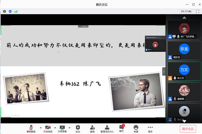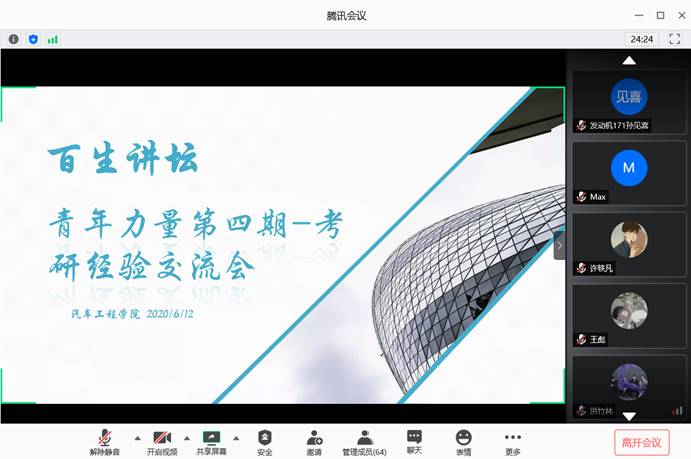 按照学校关于深化“百生讲坛”活动的相关要求,为进一步发挥榜样力量、促进学风建设、提高2017级学生考研热情和复习效率, 6月12日晚7:30,9001cc金沙利用腾讯会议组织开展了【百生讲坛】青年力量·17级考研经验分享会,分享会邀请了16级考研录取的优秀毕业生白佳宁、陈广飞、李宇轩、王衡阳四人作为主讲人,分党委副书记李秀峰、分团委书记胡霄寒以及17级考研学子参与此次活动。