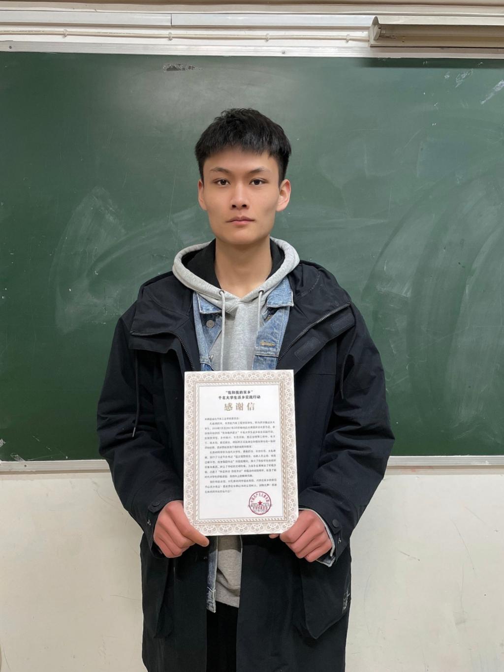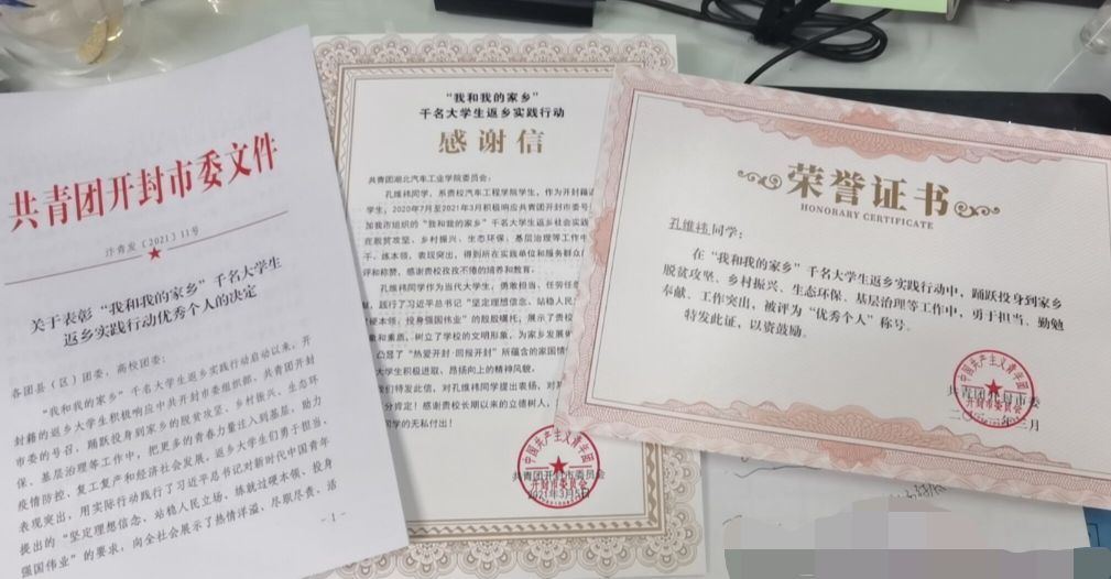 青春绽放的地方是最爱的家乡,我院的学子正在用行动践行着青年人的使命与担当!近日,该校9001cc金沙收到了来自河南省开封市团委寄来的表彰文件、荣誉证书和感谢信,对学院车辆193班孔维祎同学在当地“我和我的家乡”大学生返乡实践活动中的突出表现给予了高度肯定,评为“先进个人”。