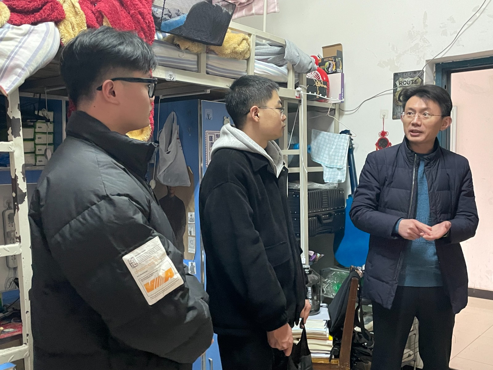 为准确掌握车院大四毕业生近期思想、学习及生活情况,推动学院就业工作稳步向前,2月23日下午,9001cc金沙分党委书记李秀峰、副书记杜昕俊,带领全体辅导员深入走访毕业生宿舍。