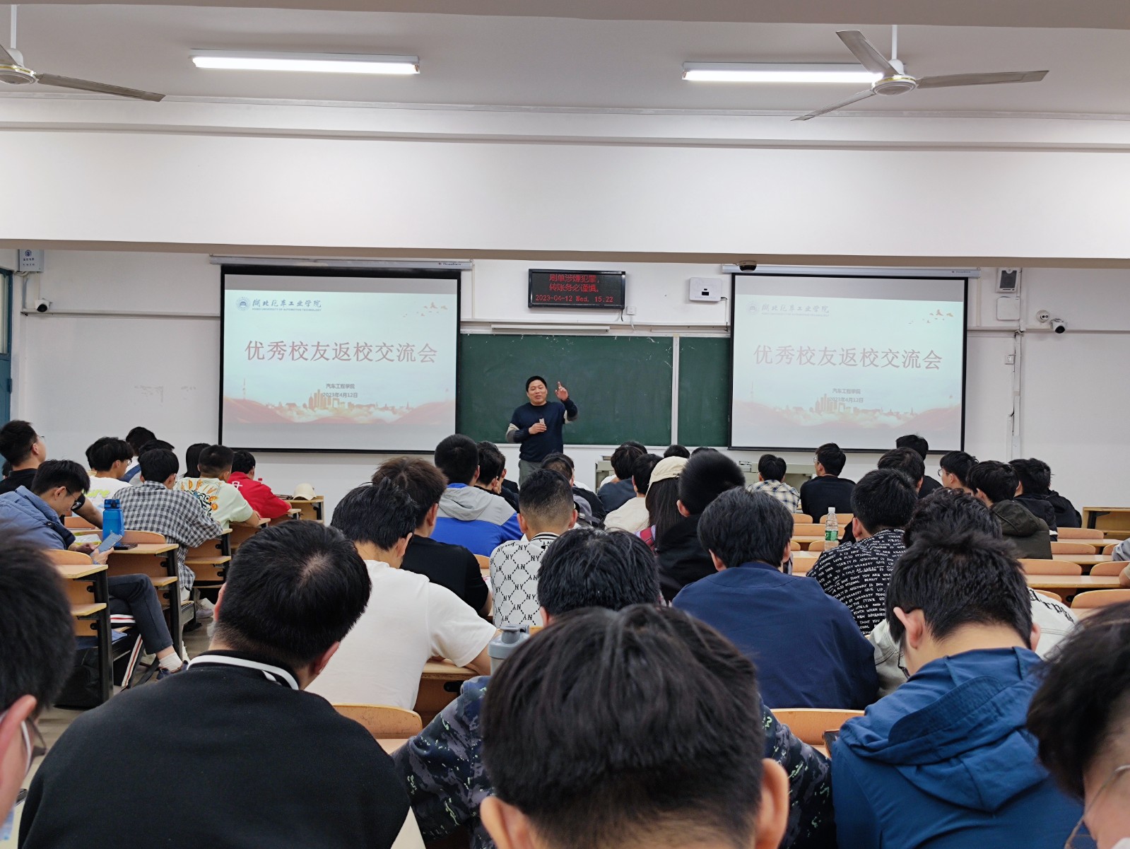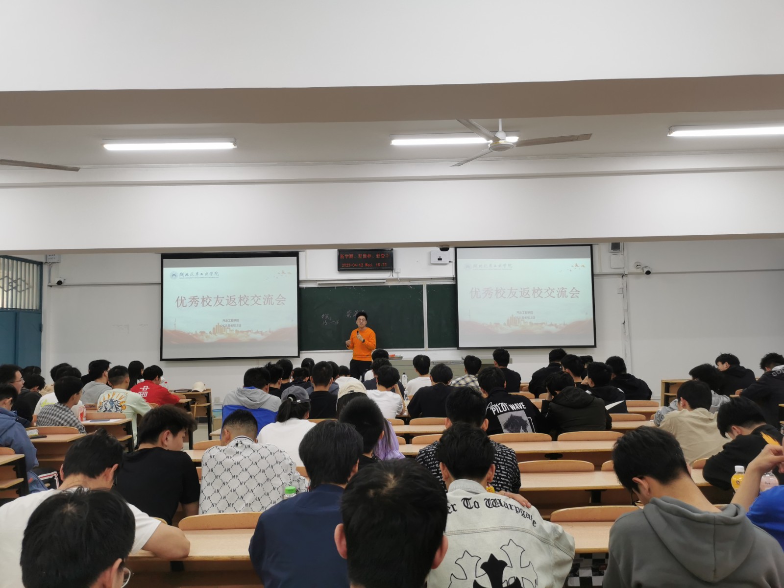 4月13日下午,9001cc金沙在5203教室举办了优秀校友交流分享会。此次经验分享会特意邀请了广汽乘用车宜昌分公司技术质量部的龙海粟和黄海涛两位优秀校友,分党委副书记杜昕俊以及100余名学生代表参加会议,学工办主任胡霄寒主持会议。