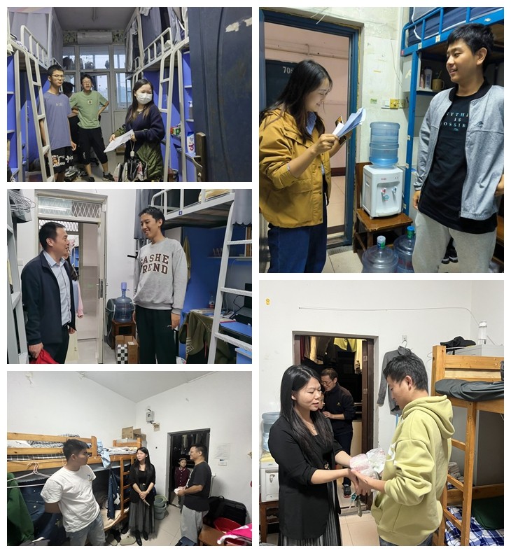 27日晚,学院班子成员带领学工办全体辅导员,又分别深入桃园、红枫、李园、西区等学生宿舍,逐间寝室走访,为全体车院学生送上节日祝福,询问假期去向和安排,仔细察看宿舍生活设施是否完善、损坏物品是否及时得到维修、是否有违规电器和物品,并就宿舍卫生、宿舍管理、安全隐患等问题与同学们亲切交流,重点强调假期请销假要求和安全注意事项,提醒同学们时刻保持警惕,谨防电信诈骗,确保个人人身和财务安全。