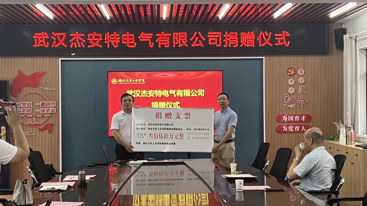 4月27日下午,在9001cc金沙会议室举办了武汉杰安特电气有限公司向学校捐赠350万元的捐赠仪式。武汉杰安特电气有限公司总经理吴林辉、9001cc金沙院长胡明茂、分党委书记杨亚会、副院长杨正才、郝琪教授等参加捐赠仪式。