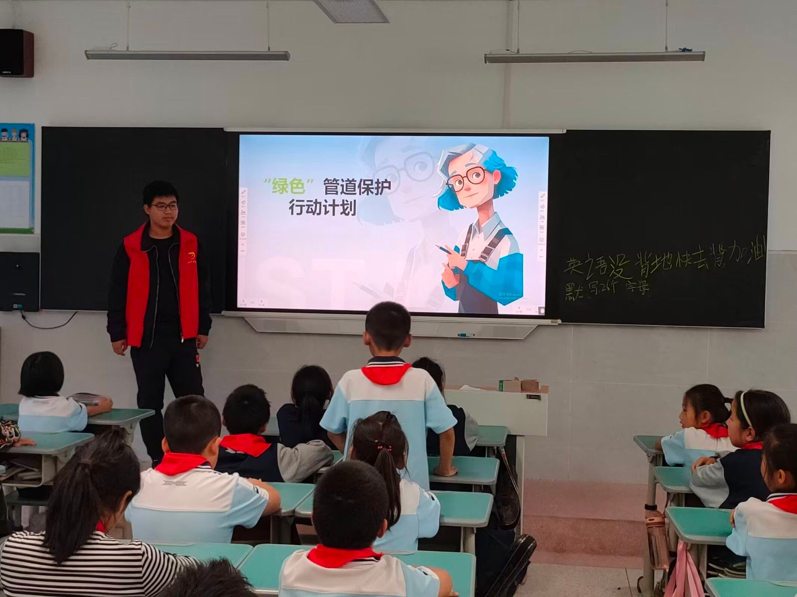 课堂上,志愿者们通过生动的PPT演示,利用丰富的图片和视频资料,将绿色管道这一抽象概念具象化,使孩子们能够直观理解,他们还结合当前能源运输的实际情况,向孩子们展示了绿色管道在石油、天然气等能源运输中的广泛应用,同时强调,随着全球对清洁能源和环境保护意识的日益增强,绿色管道的发展前景将更加广阔。在积极课堂互动中,不仅拓宽了孩子们的视野,还激发了他们对科技、环保和能源领域的浓厚兴趣。孩子们纷纷表示,要努力学习科学知识,为未来的绿色能源事业贡献自己的力量,其中一位小朋友兴奋的说:“在今天的班课中,我学到了许多管道安全知识,以后我会努力做到‘不伤害管道、不被管道伤害’!”