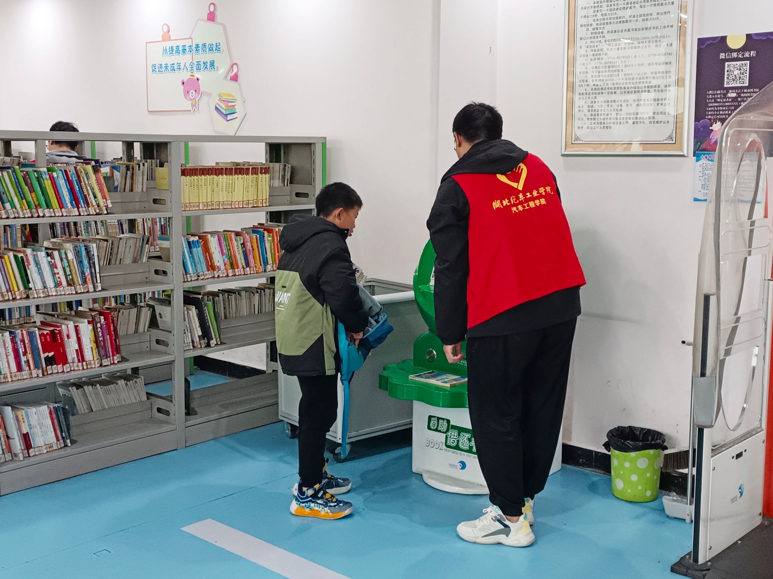 活动,志愿者们分工明确各司其职。一部分志愿者担任借书还书引导员,耐心讲解借阅流程,确保读者顺利借阅或归还;另一部分则协助整理书籍,保持书架整齐有序。全体志愿者的努力营造了安静和谐的阅读氛围。