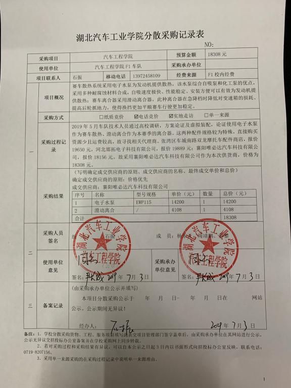 F1车队分散采购记录表(电子水泵、滑动离合器)