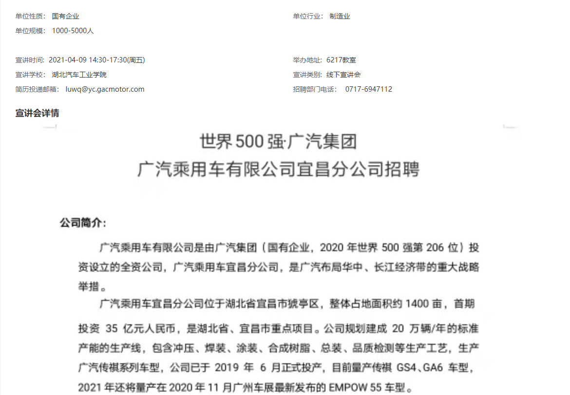 广汽乘用车有限公司是由广汽集团(国有企业,2020 年世界 500 强第 206 位)投资设立的全资公司,广汽乘用车宜昌分公司,是广汽布局华中、长江经济带的重大战略举措。