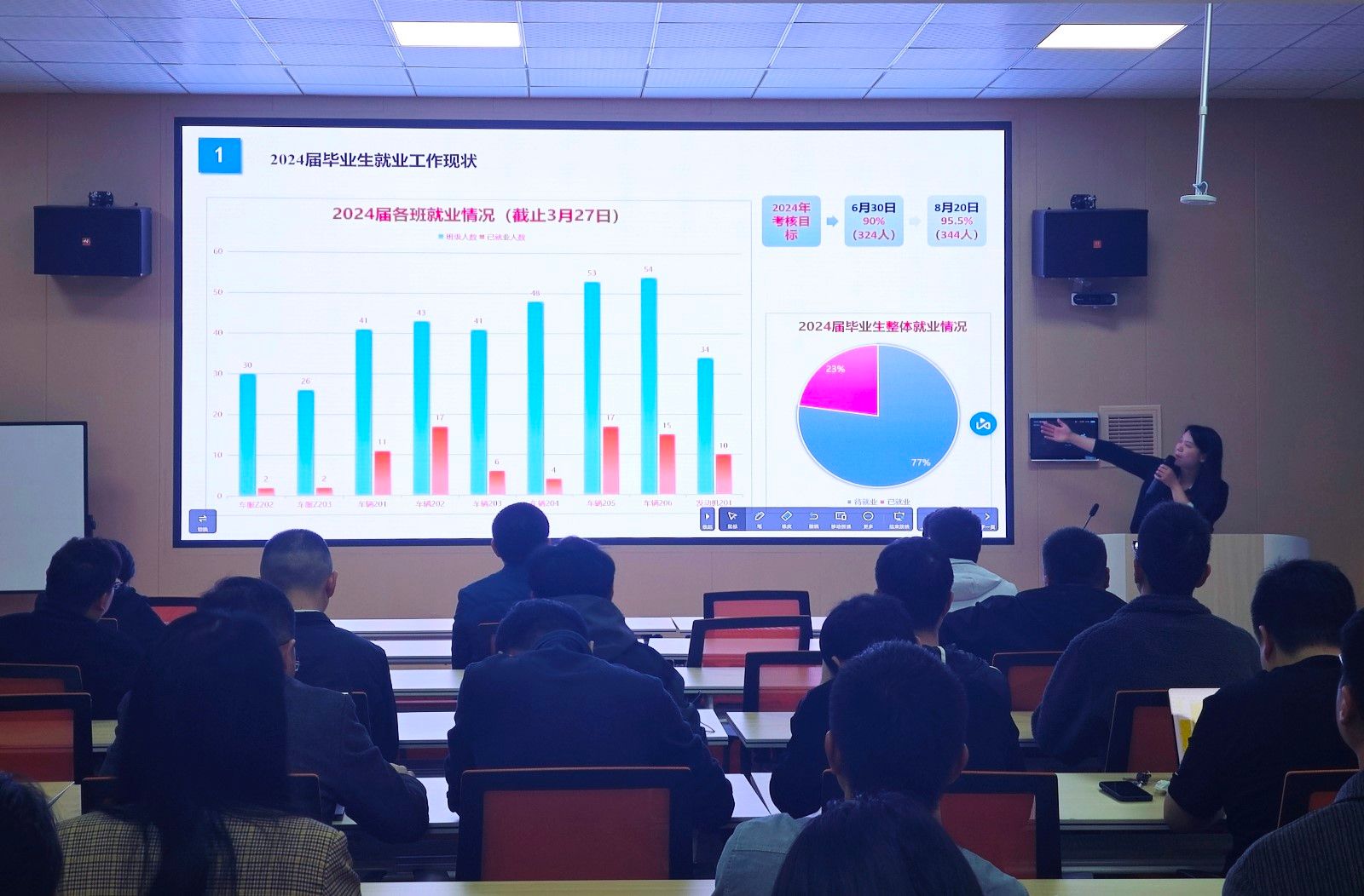 会上,就业辅导员李键雯汇报了学院近五年的毕业生就业去向落实情况及当前2024届毕业生就业现状,详细解读《我院就业工作考核细则》,明确2024年就业工作目标考核任务。