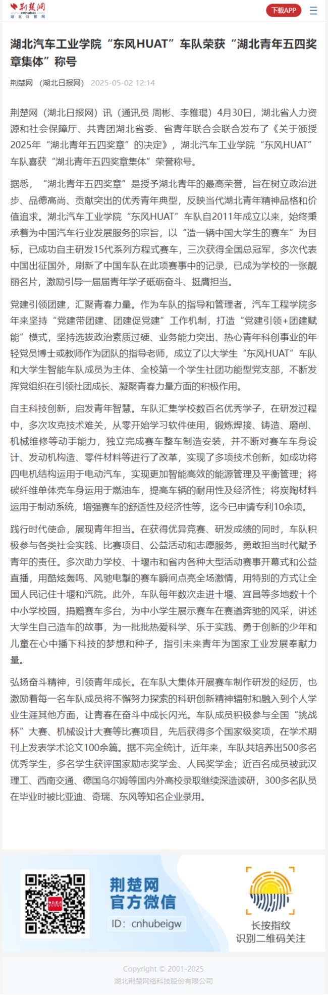 【荆楚网】我院“东风HUAT”车队荣获“湖北青年五四奖章集体”称号