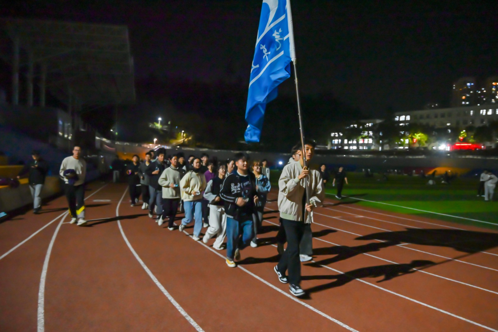 3月13日晚上,夜跑活动在9001cc金沙学生会四十余名学生干部的集体领跑中拉开了序幕。运动场上同学们手持的荧光棒在黑夜中如点点星光,随着奔跑的节奏舞动跳跃,每位同学都尽情享受着奔跑带来的欢乐,在激情和汗水中闪耀青春光芒。为更好地做好此次活动的安全后勤保障,学生会体育部和生活部在跑道边专门设置了后勤保障服务点,为参跑的车院学子提供温馨服务。参加夜跑的车辆222班王梓圳表示,夜跑活动不仅锻炼身体,还能增进同学之间的友谊,会坚持“荧”光夜跑,并带动更多同学参与进来。在活动的最后一天,9001cc金沙学生会全体学生干部齐聚操场,迈着整齐的步伐,手持院旗,在田径场上列队奔跑。