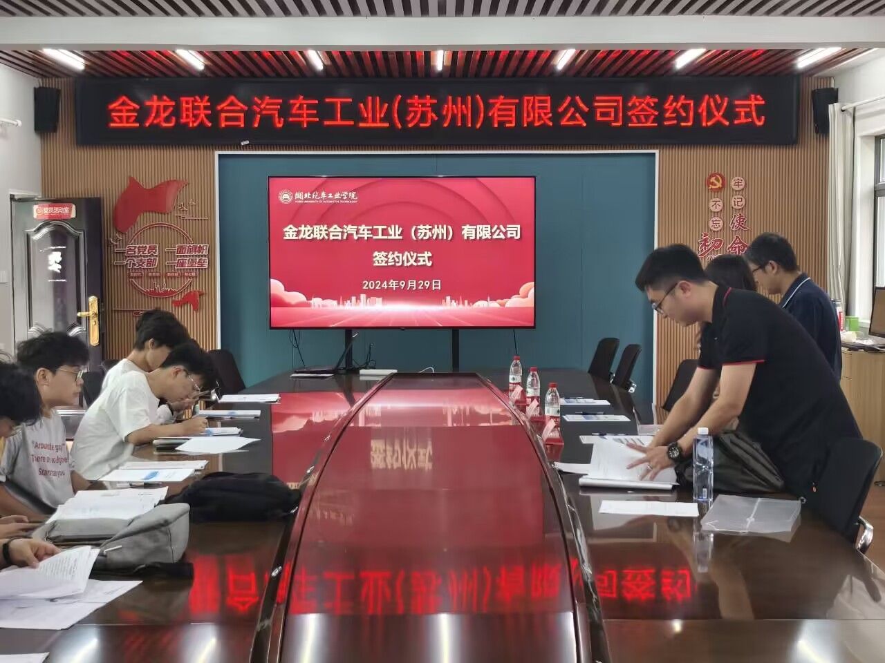 会后,厦门金龙汽车集团旗下金龙联合汽车工业(苏州)有限公司在学院党员活动室举办2025届毕业生就业签约仪式。