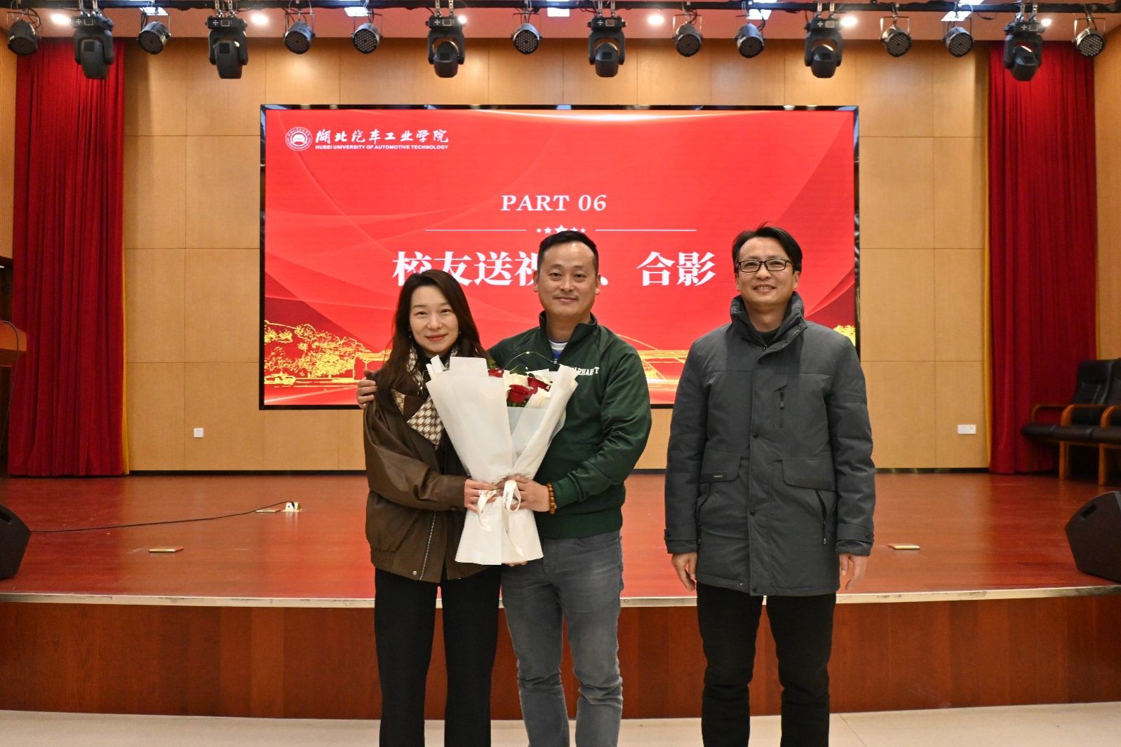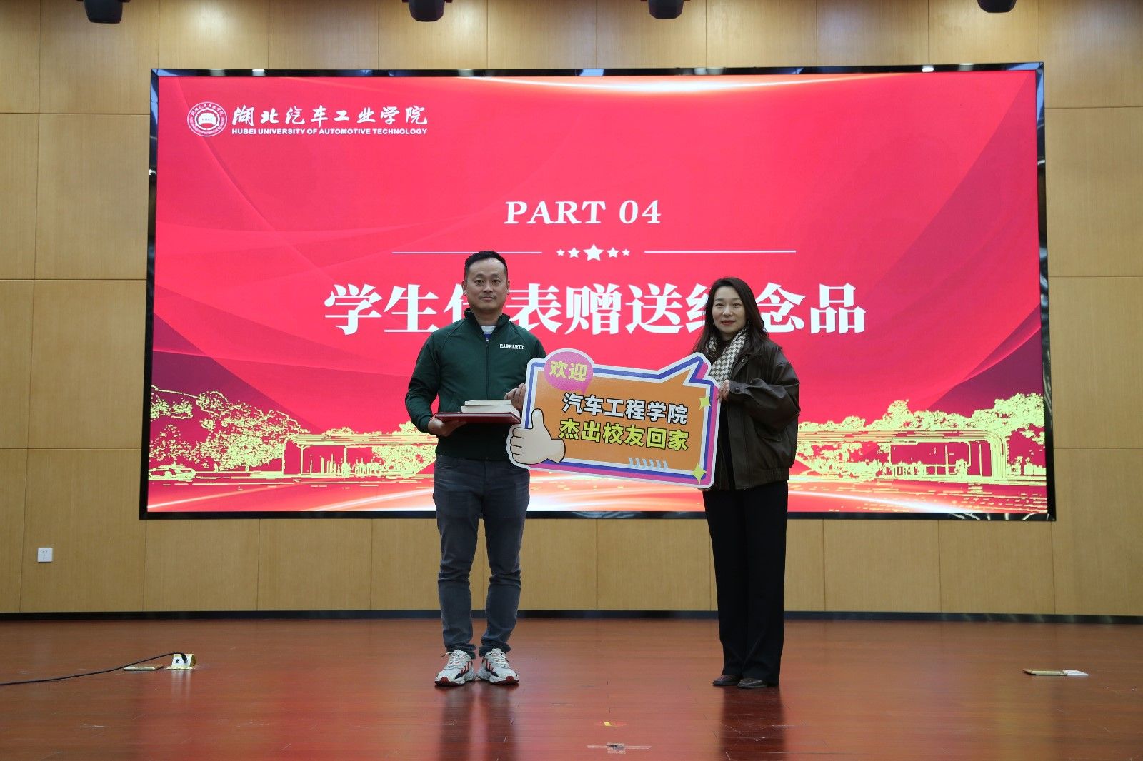 在得知报告会当天也是吴必权先生与夫人郝娟女士14周年结婚纪念日后,学工部长王关锋为两位在汽院结缘、共同支持、互相成就的校友伉俪送上衷心的祝福和鲜花,嘱托两位校友一如既往的关注支持母校,常回母校看看,为母校的发展建言献策,共同见证我院更加美好的明天。学生代表李函还为优秀学长送上学校校徽等纪念品。
