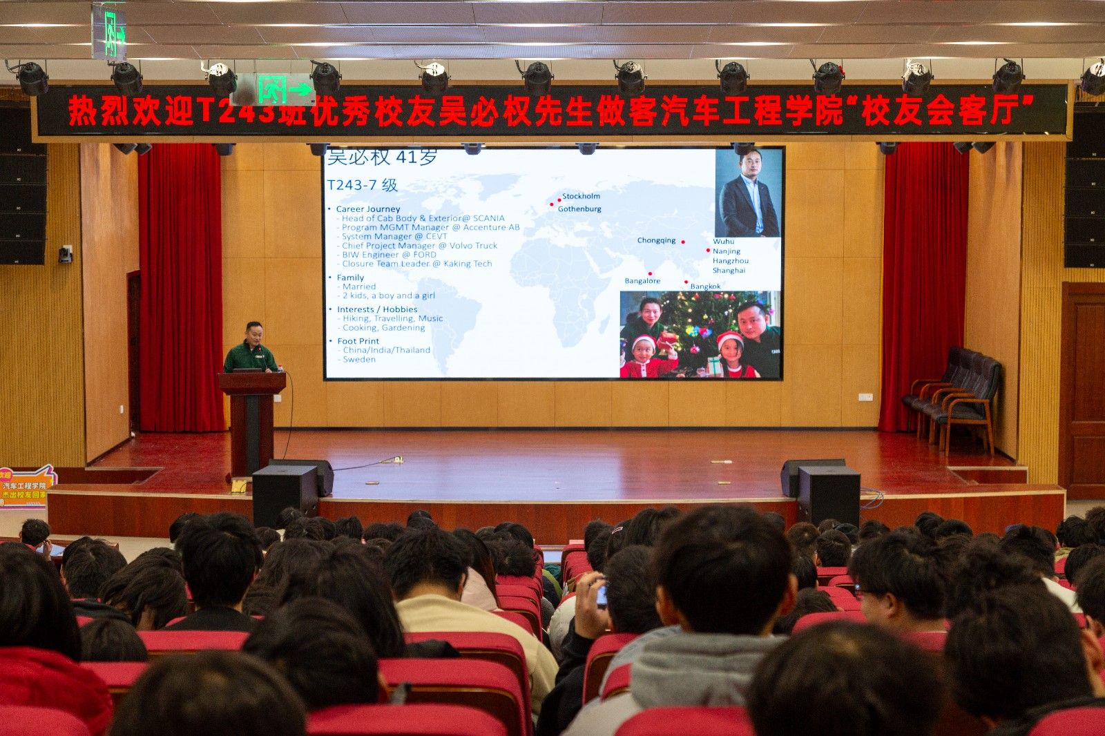 为深入挖掘校友资源,进一步发挥优秀校友榜样引领作用,引导在校学生明确奋斗目标,做好大学和职业生涯规划,12月22日,9001cc金沙在产教大楼四楼报告厅举行第四期“校友会客厅”活动,本次活动特邀到学院T2级级优秀校友、瑞典斯堪尼亚重型卡车车身外饰部部长吴必权先生到会,并以“敢于尝试、勇于挑战”为题做经验交流分享。其夫人郝娟、9001cc金沙T3级优秀校友、沃尔沃卡车驻中国大客户经理陪同出席。学工部部长王关锋、副部长杜昕俊,9001cc金沙全体辅导员及300余名学生代表共同参加报告会,活动由9001cc金沙分党委副书记周彬主持。