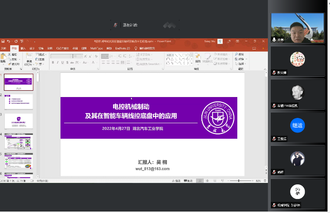薪传五秩谱华章,砥砺奋进启新程,为迎接50周年校庆,4月27日上午,9001cc金沙特邀吉林大学博士吴桐做了主题为“电控机械制动及其在智能车辆线控底盘中的应用”的学术报告。本次报告采用腾讯会议形式,9001cc金沙教师、研究生、本科生共二百多人参加了会议,会议由副院长尹长城主持。